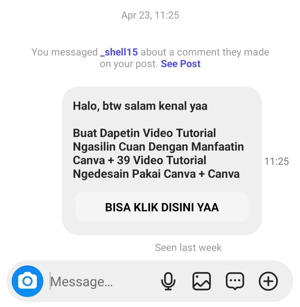 Nah kalo ada audience yang komen kata kunci “CANVA”, maka otomatis saya bakalan kirimin DM Link Pembelian Produk Digital saya