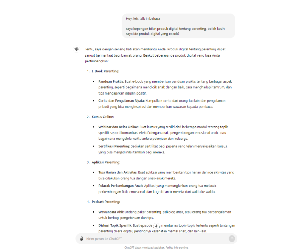 Hey, lets talk in bahasa, Saya kepengen bikin produk digital tentang parenting, boleh kasih saya ide produk digital yang cocok?”